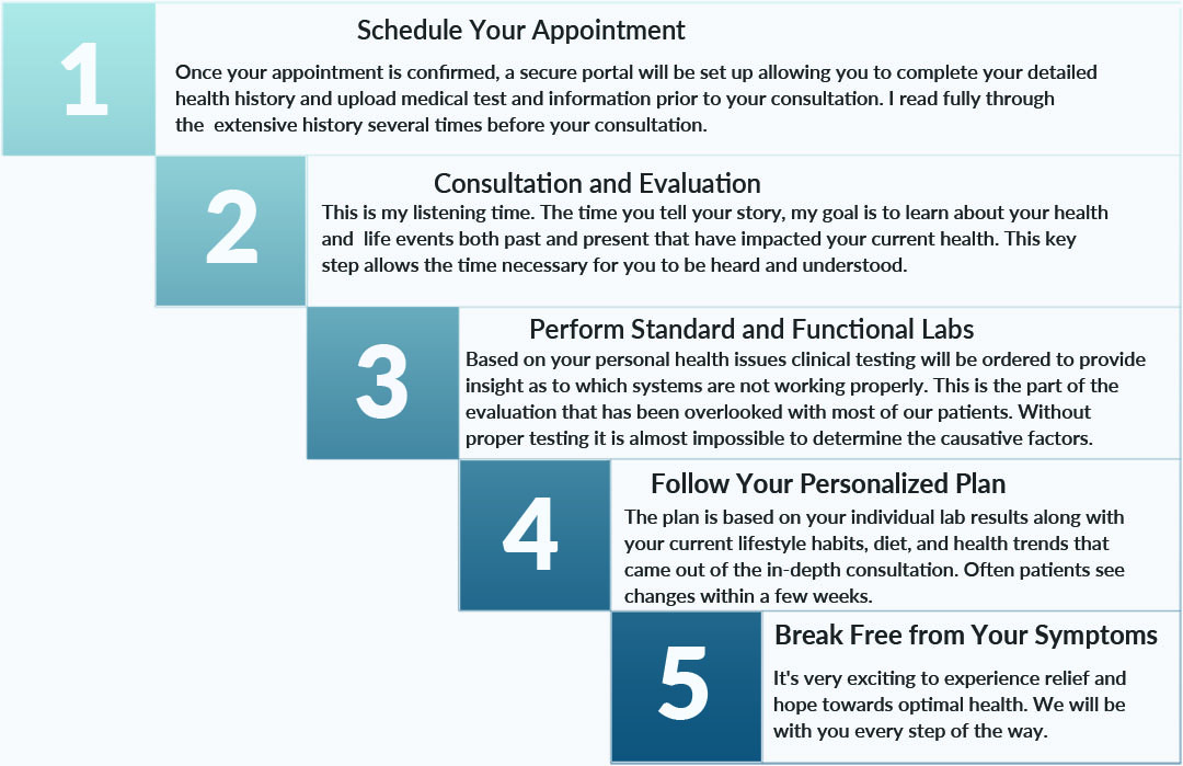 During your first appointment, you will be guided through our unique timeline history and other personalized assessments. You will leave with a customized plan to begin breaking free of your symptoms.